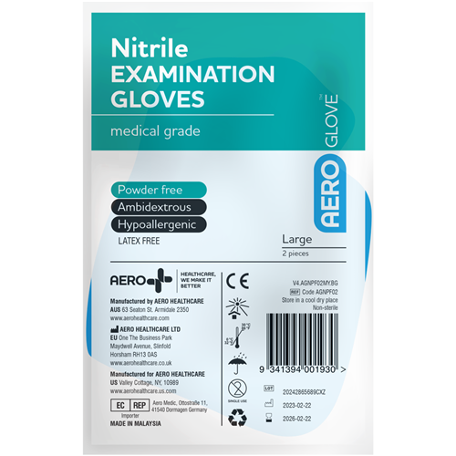 Each glove is anatomically shaped to reduce fatigue during prolonged use and comes individually presented to support infection control and hygiene protocols. AeroGlove nitrile gloves are suitable for various first aid kits, clinics, dental practices, and general-purpose examination settings.