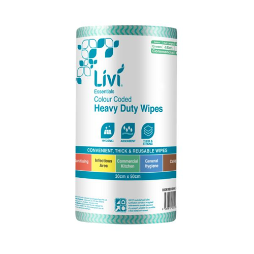 Livi Essentials Commercial Wipes are strong, absorbent, and HACCP food-safe. Colour-coded to prevent cross-contamination. Reusable and Chux-equivalent.