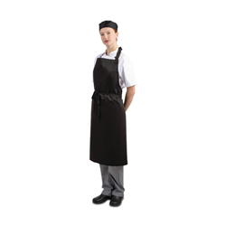 - Stylish and versatile black bib apron that combines functionality with a sleek design