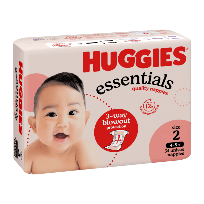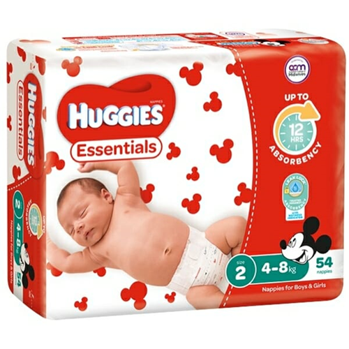 - Keep your little one dry and comfortable with the Huggies Nappies Essentials in Infant Unisex Size 2 4-8kg, 54 Pack x 4.