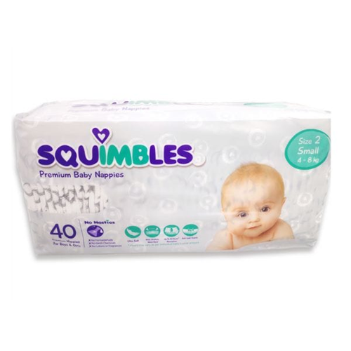 - Stay comfortable and dry with Squimbles Nappies Small Size 2 Pack 40, designed for infants and toddlers.